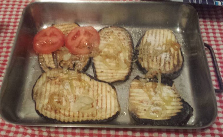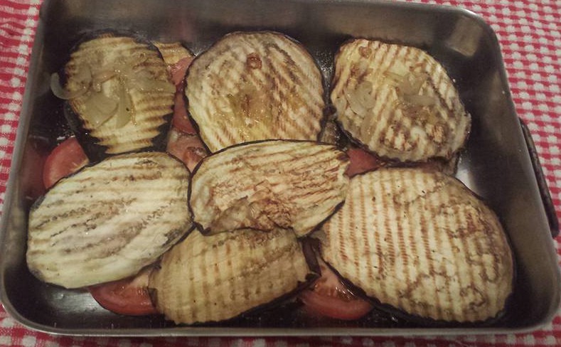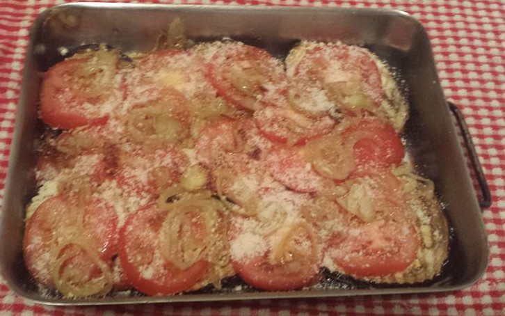 Tagliate i pomodori a rondelle, togliere le cipolle dal fuoco... In una teglia mettere alla base uno strato di cipolle, uno strato di melanzane fatte eventualmente scongelare precedentemente, un altro strato di cipolle, una spolverata di parmigiano, uno di pomodori un filo d'olio e un pizzico di sale. Fare ora un altro giro di strati in ordine di Melanzane, cipolle,parmigiano, pomodori, cipolle, parmigiano,un filo d'olio e un pizzico di sale.